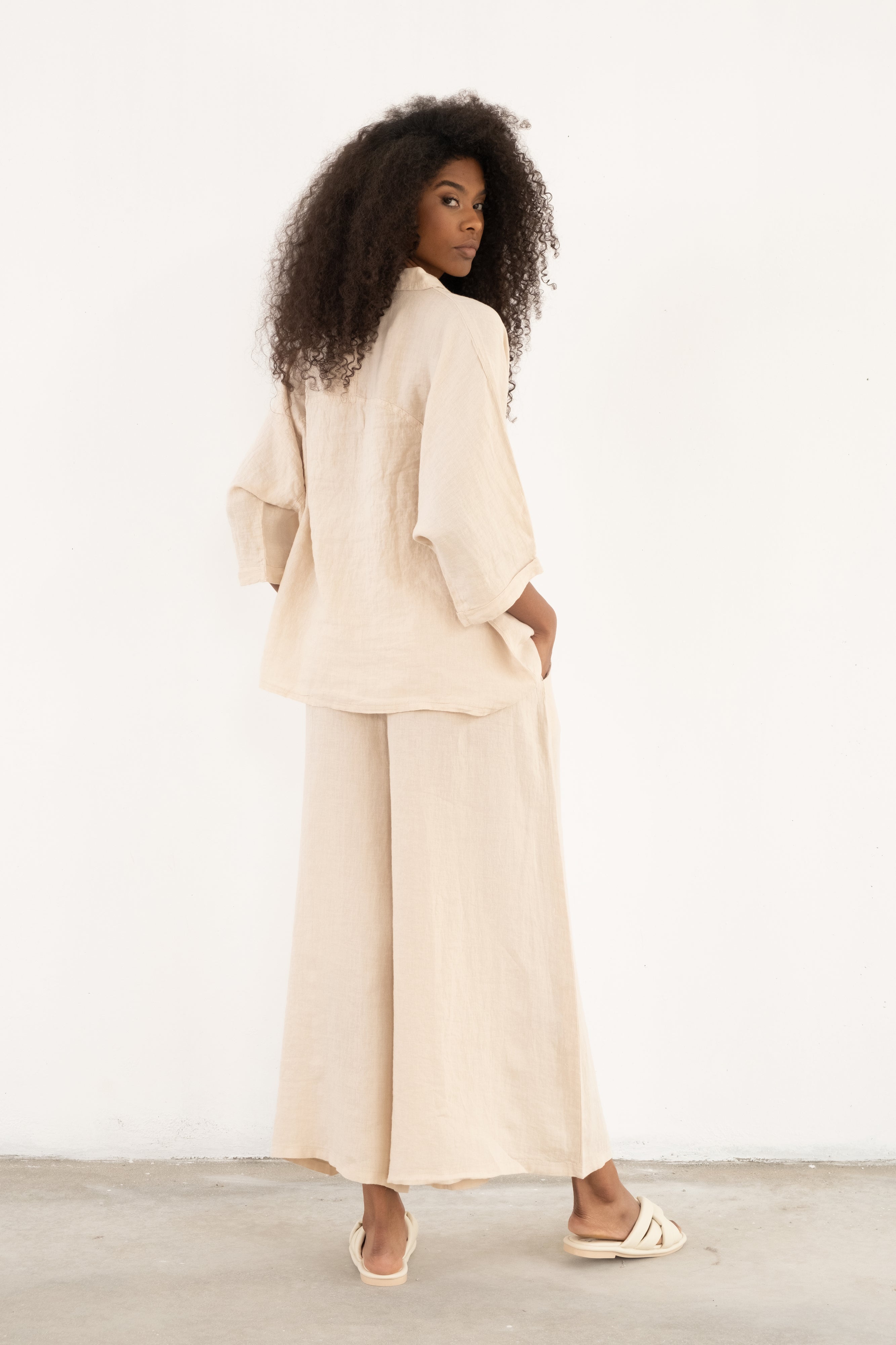 With the unique coolness and natural feel of pure linen on your skin, these wide-leg trousers bring Ipekci Otantik's bohemian elegance to your wardrobe. Their high-waisted cut and flowing legs celebrate your freedom of movement, while the elasticated waistband promises all-day comfort. Their unique colors, achieved through special piece dyeing and washing techniques, and the velvety texture of 100% linen will leave you feeling both stylish and at ease with every step.