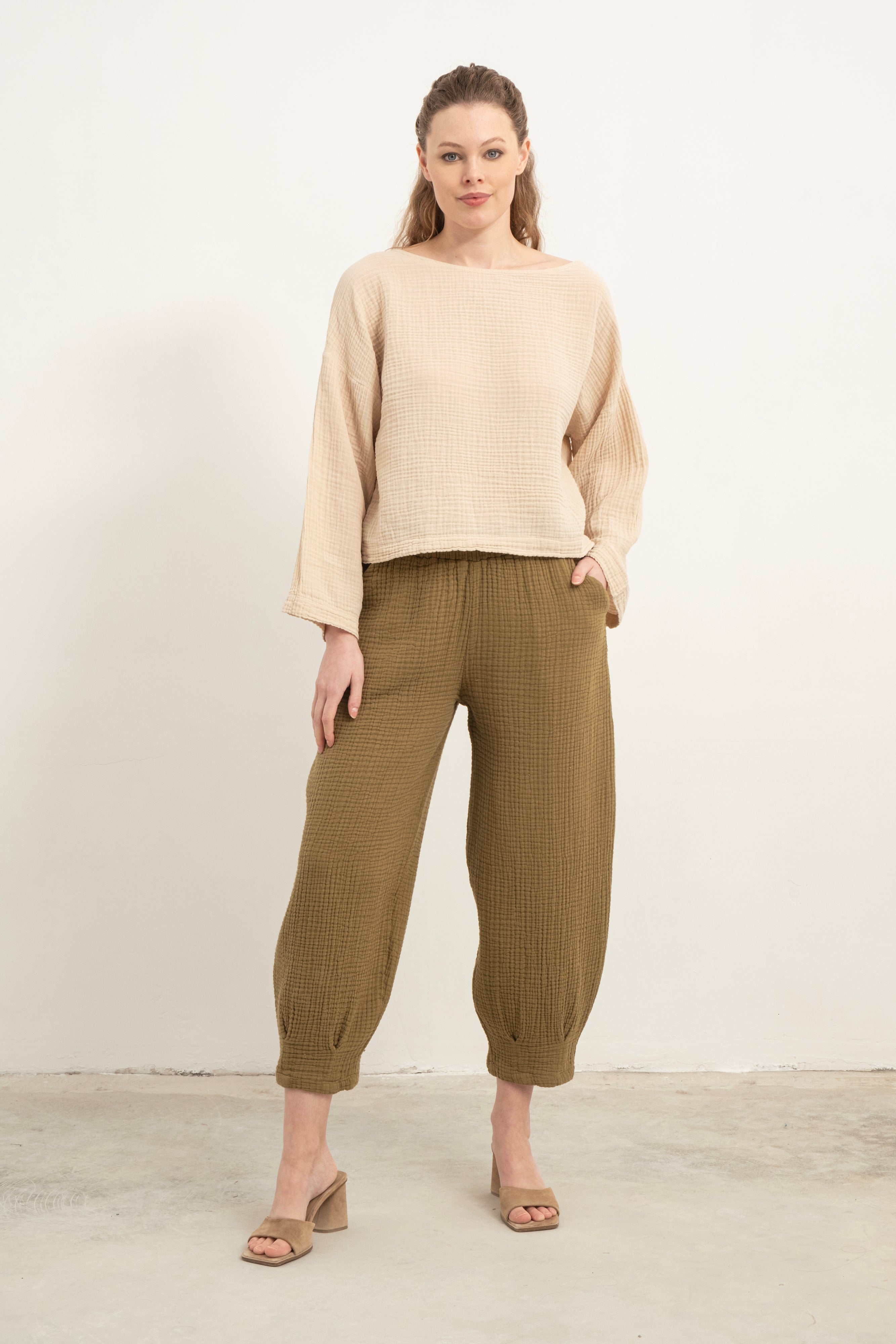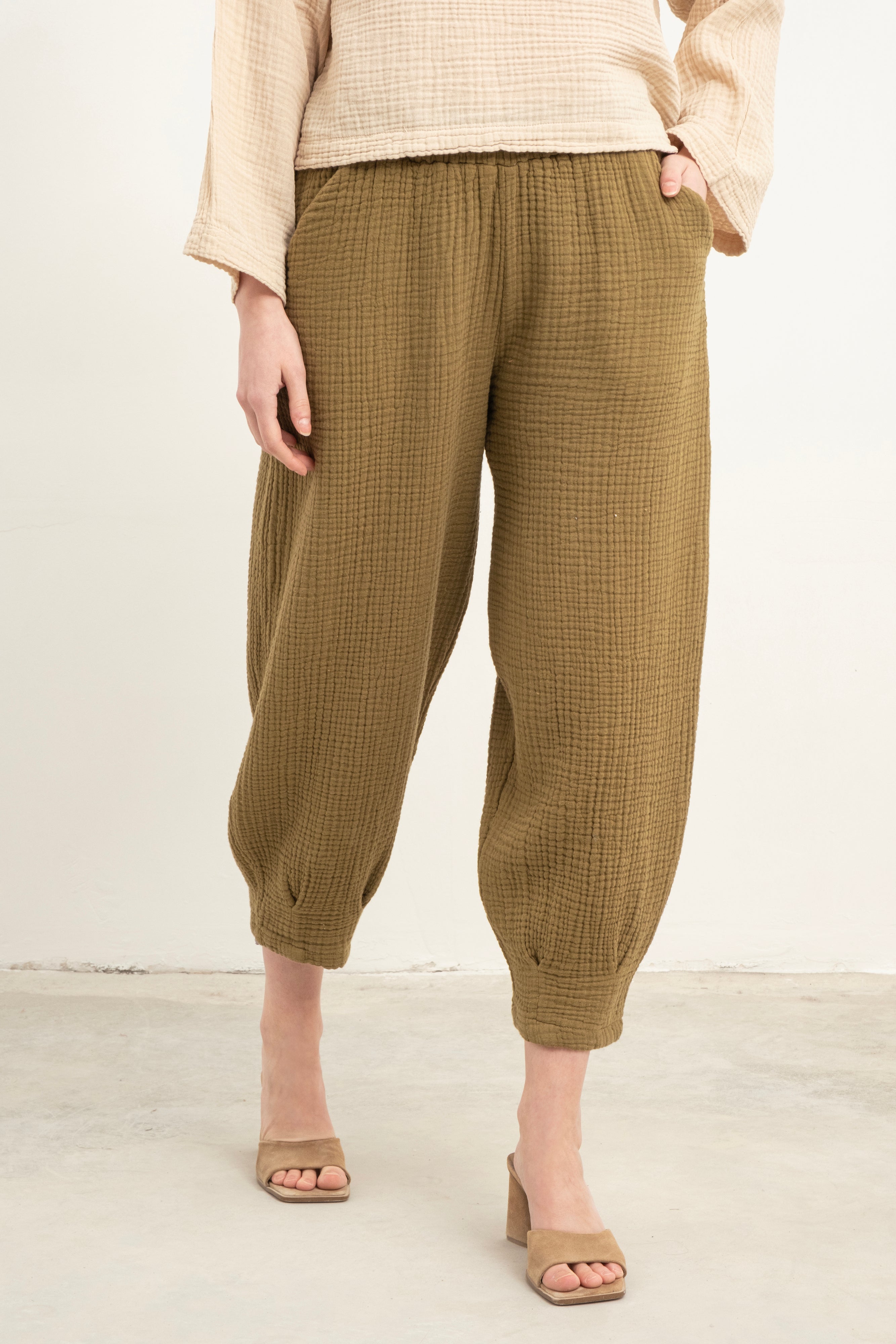 Doğanın en saf armağanlarından biri olan dört katlı %100 müslin kumaşın o eşsiz yumuşaklığı ve nefes alan dokusuyla tanışmaya hazır olun. İpekçi Otantik'in "az çoktur" felsefesini ve doğayla uyumlu yaşam tarzını yansıtan bu pileli pantolon, her bir ilmeğinde konforu ve zarafeti bir araya getiriyor. Özel parça boyama ve yıkama işlemleriyle her bir pantolona özgün bir karakter ve karakteristik renkler kazandırılırken, cildinize dost doğal yapısı ve bol kesimiyle gün boyu özgürlüğün ve hafifliğin keyfini çıkaracaksınız.